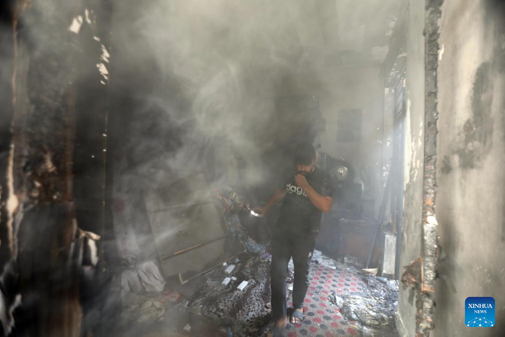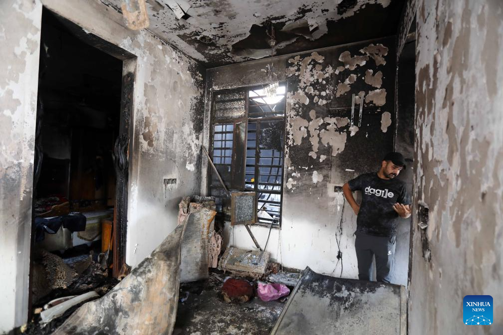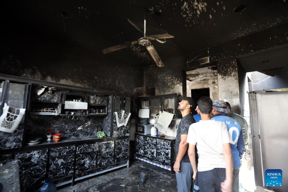 People check a house after a fire in Baghdad, Iraq, on July 23, 2025. A fire broke out in a civilian house in eastern Baghdad on Wednesday, killing at least four and severely injuring two others, a source from the Iraqi Interior Ministry told Xinhua. (Xinhua/Khalil Dawood)