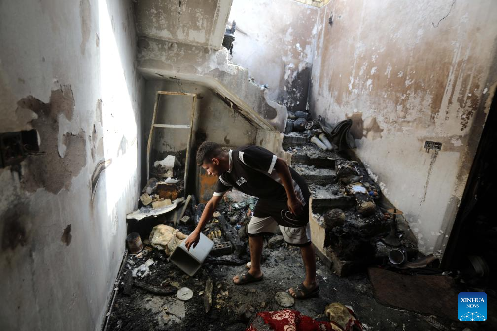 A man tries to collect items inside a house after a fire in Baghdad, Iraq, on July 23, 2025. A fire broke out in a civilian house in eastern Baghdad on Wednesday, killing at least four and severely injuring two others, a source from the Iraqi Interior Ministry told Xinhua. (Xinhua/Khalil Dawood)