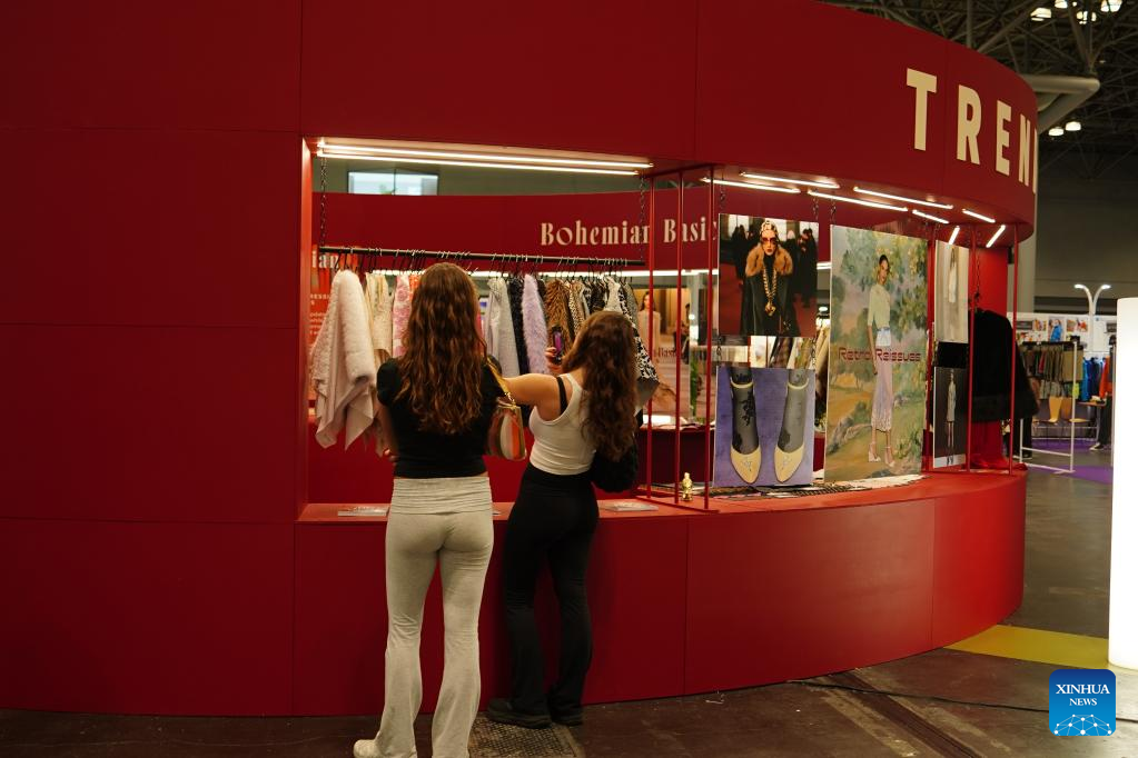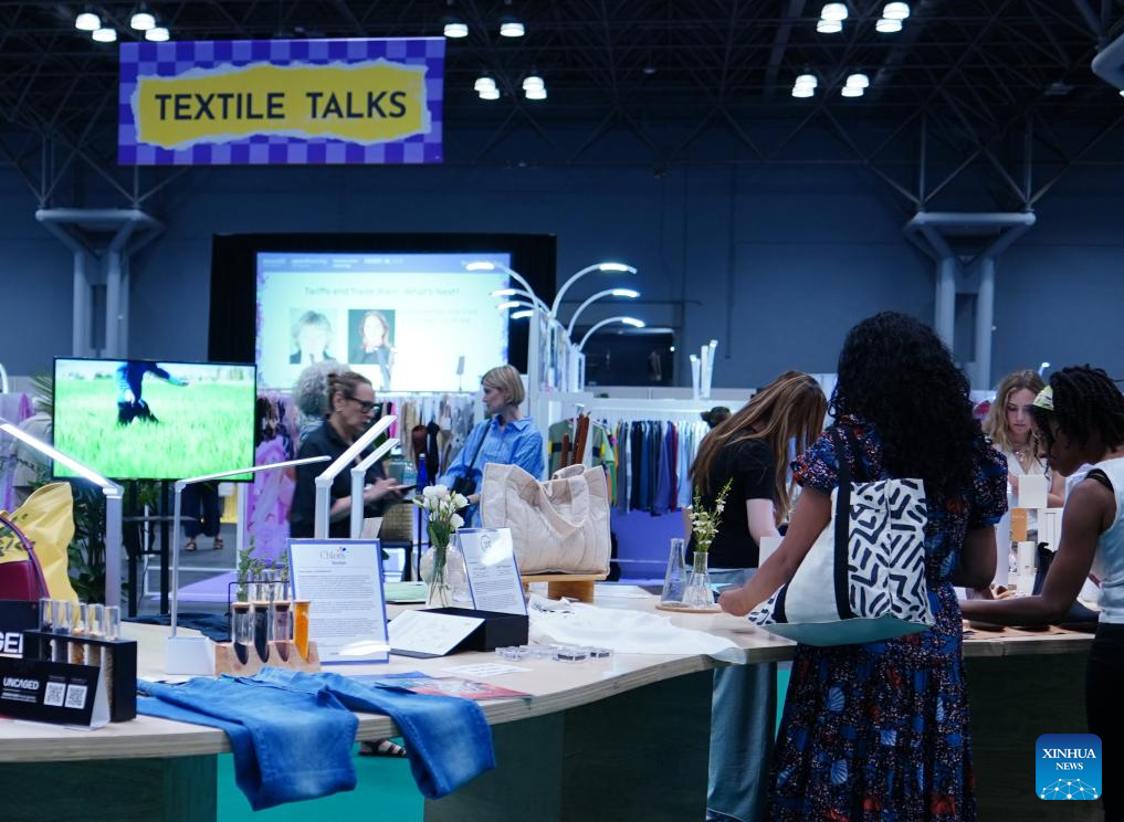 Attendees view textile samples at a display booth during Texworld NYC, the largest textile sourcing trade show on the U.S. East Coast, in New York City, the United States, on July 23, 2025. (Photo by Ada Zhang/Xinhua)