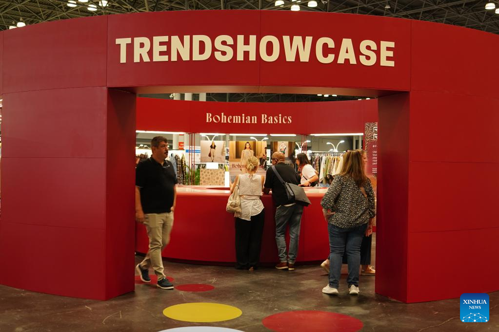 Attendees walk past a display booth at Texworld NYC, the largest textile sourcing trade show on the U.S. East Coast, in New York City, the United States, on July 23, 2025. (Photo by Ada Zhang/Xinhua)