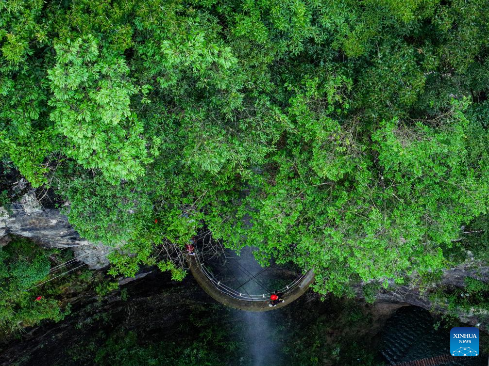 Tourists walk across a suspension bridge in a giant sinkhole in Kaiyang County, southwest China's Guizhou Province, July 22, 2025. Guizhou Province is renowned for its extensive karst landscape, which is distinguished by its numerous giant sinkholes, locally called "tiankeng" or "heavenly pits." The natural sinkholes are increasingly recognized for their unique tourism values. (Xinhua/Ou Dongqu)