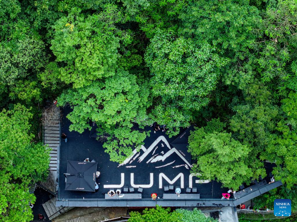 An aerial drone photo taken on July 22, 2025 shows tourists resting on an observation deck in a giant sinkhole in Kaiyang County, southwest China's Guizhou Province. Guizhou Province is renowned for its extensive karst landscape, which is distinguished by its numerous giant sinkholes, locally called "tiankeng" or "heavenly pits." The natural sinkholes are increasingly recognized for their unique tourism values. (Xinhua/Ou Dongqu)