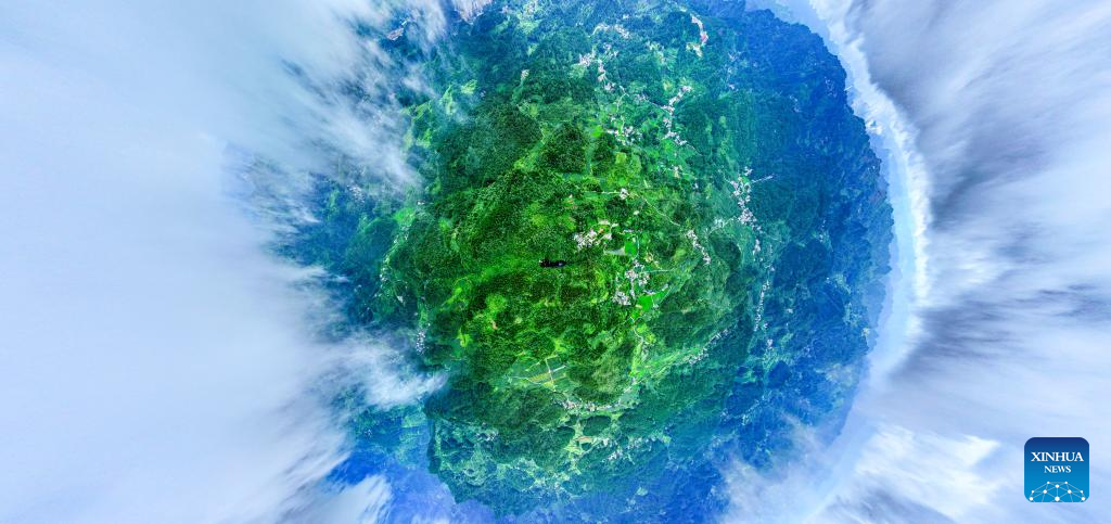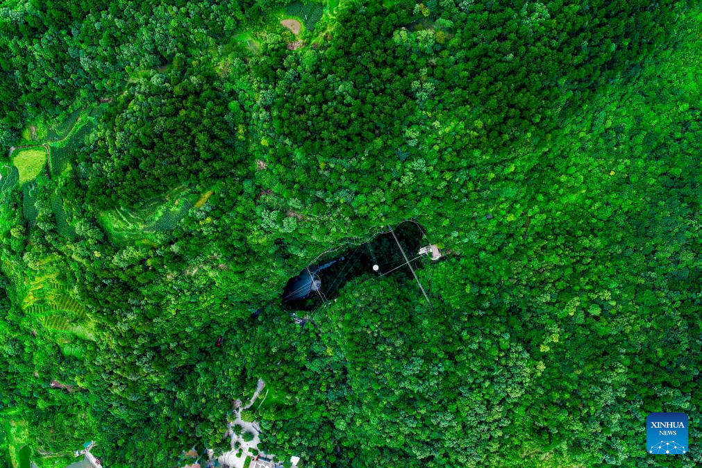 An aerial drone photo taken on July 22, 2025 shows a panoramic view of a giant sinkhole in Kaiyang County, southwest China's Guizhou Province. Guizhou Province is renowned for its extensive karst landscape, which is distinguished by its numerous giant sinkholes, locally called "tiankeng" or "heavenly pits." The natural sinkholes are increasingly recognized for their unique tourism values. (Xinhua/Ou Dongqu)