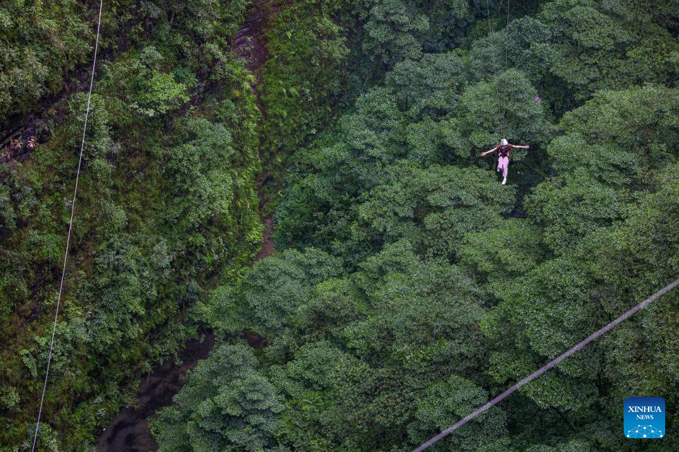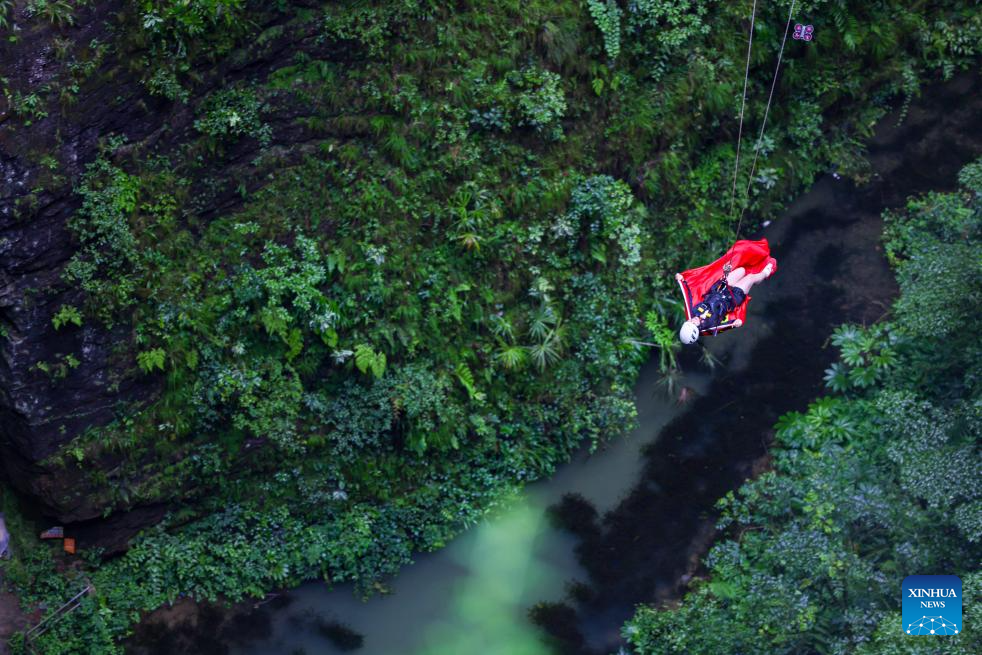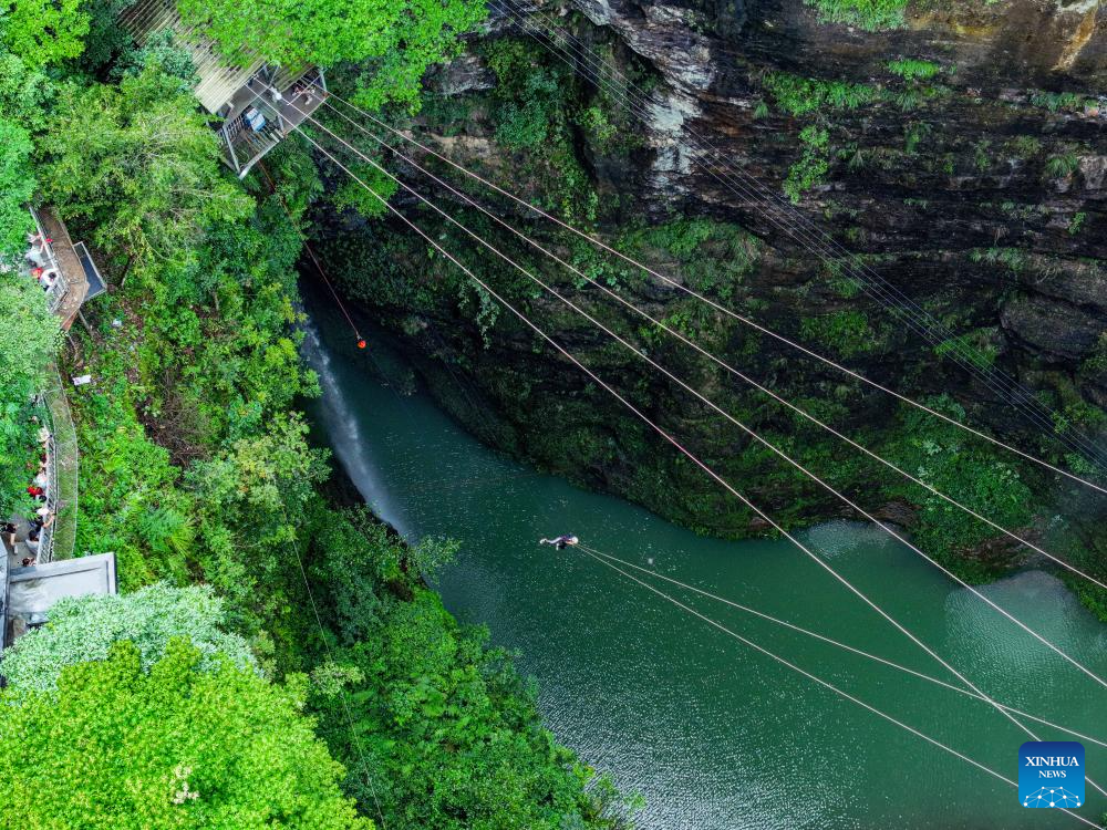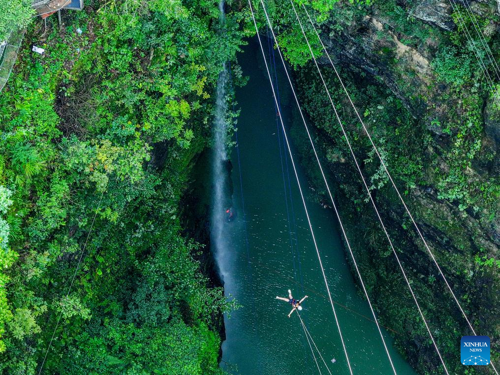 This photo taken on July 22, 2025 shows a tourist playing a "super giant swing" in a giant sinkhole in Kaiyang County, southwest China's Guizhou Province. Guizhou Province is renowned for its extensive karst landscape, which is distinguished by its numerous giant sinkholes, locally called "tiankeng" or "heavenly pits." The natural sinkholes are increasingly recognized for their unique tourism values. (Xinhua/Ou Dongqu)