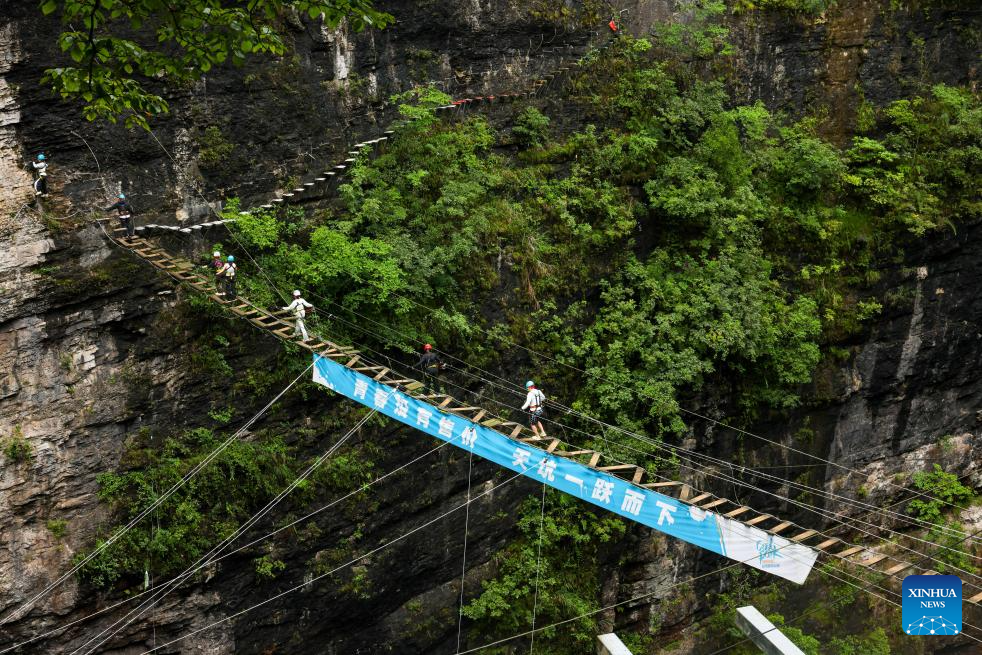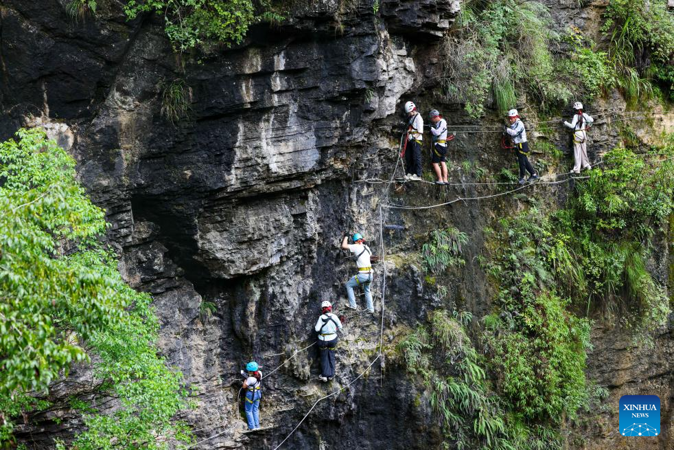 Tourists enjoy rock-climbing in a giant sinkhole in Kaiyang County, southwest China's Guizhou Province, July 22, 2025. Guizhou Province is renowned for its extensive karst landscape, which is distinguished by its numerous giant sinkholes, locally called "tiankeng" or "heavenly pits." The natural sinkholes are increasingly recognized for their unique tourism values. (Xinhua/Ou Dongqu)