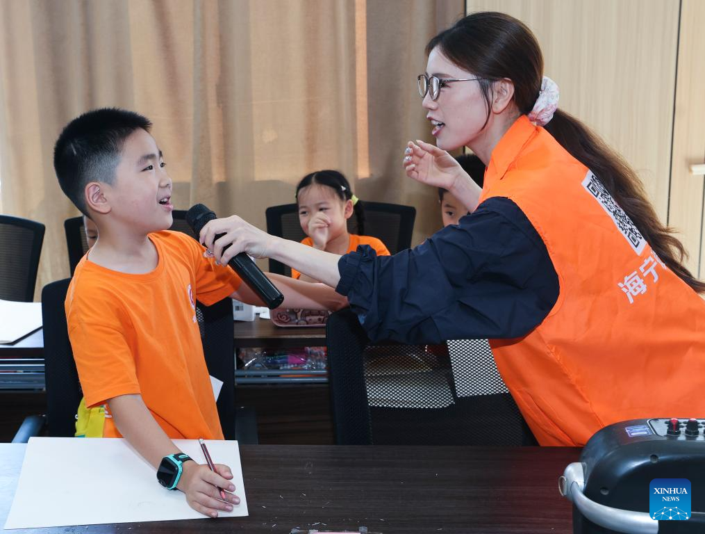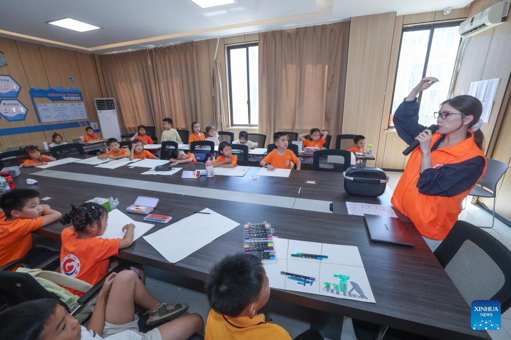 Kids learn drawing under the guidance of volunteers during a public-interest summer tutoring program in Xishan community of Haining City, east China's Zhejiang Province, July 23, 2025. During the summer vacation, Xishan community held a 45-day public-interest summer tutoring program. The program featured tutoring activities such as painting, calligraphy, reading, handicrafts, and homework assistance. More than 150 children from kindergartens and primary schools participated in the program, accompanied by college student volunteers and social workers. (Xinhua/Xu Yu)