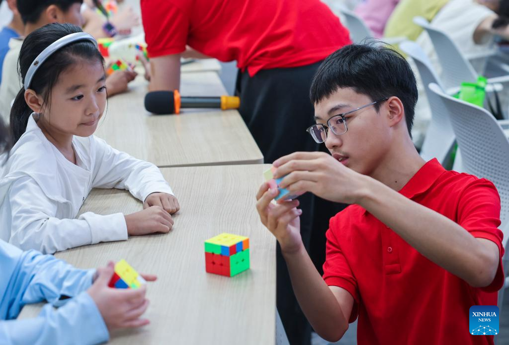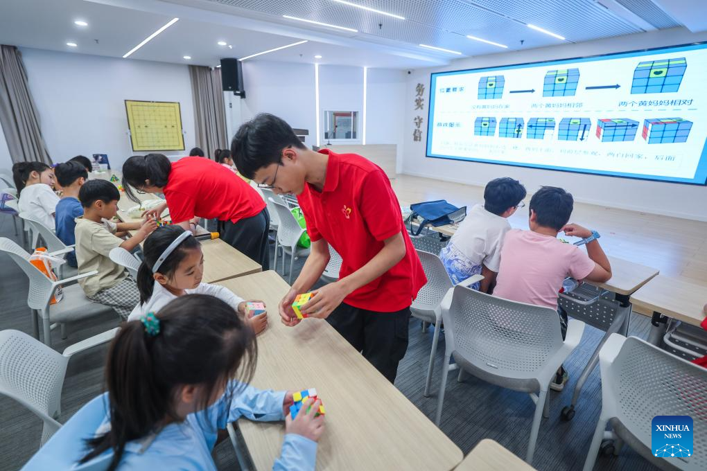 A volunteer teaches kids how to play Rubik's Cubes during a public-interest summer tutoring program in Xishan community of Haining City, east China's Zhejiang Province, July 23, 2025. During the summer vacation, Xishan community held a 45-day public-interest summer tutoring program. The program featured tutoring activities such as painting, calligraphy, reading, handicrafts, and homework assistance. More than 150 children from kindergartens and primary schools participated in the program, accompanied by college student volunteers and social workers. (Xinhua/Xu Yu)
