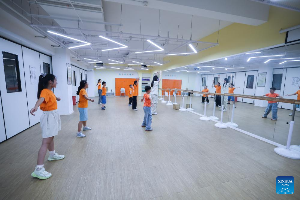 Kids attend a dance class during a public-interest summer tutoring program in Xishan community of Haining City, east China's Zhejiang Province, July 23, 2025. During the summer vacation, Xishan community held a 45-day public-interest summer tutoring program. The program featured tutoring activities such as painting, calligraphy, reading, handicrafts, and homework assistance. More than 150 children from kindergartens and primary schools participated in the program, accompanied by college student volunteers and social workers. (Xinhua/Xu Yu)