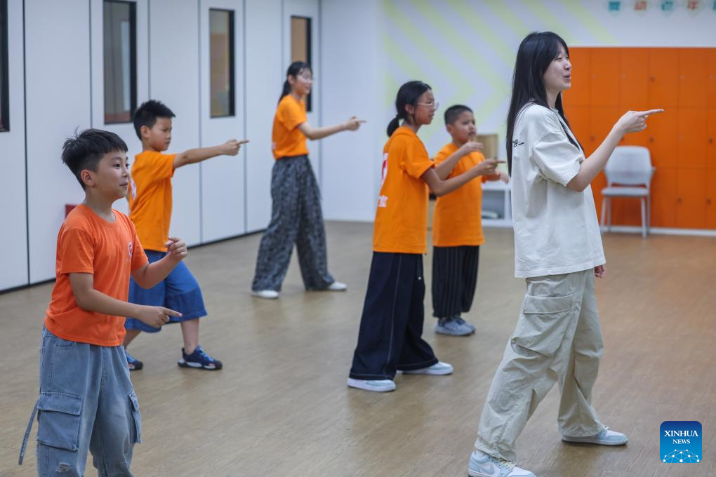 A volunteer teaches kids dancing during a public-interest summer tutoring program in Xishan community of Haining City, east China's Zhejiang Province, July 23, 2025. During the summer vacation, Xishan community held a 45-day public-interest summer tutoring program. The program featured tutoring activities such as painting, calligraphy, reading, handicrafts, and homework assistance. More than 150 children from kindergartens and primary schools participated in the program, accompanied by college student volunteers and social workers. (Xinhua/Xu Yu)