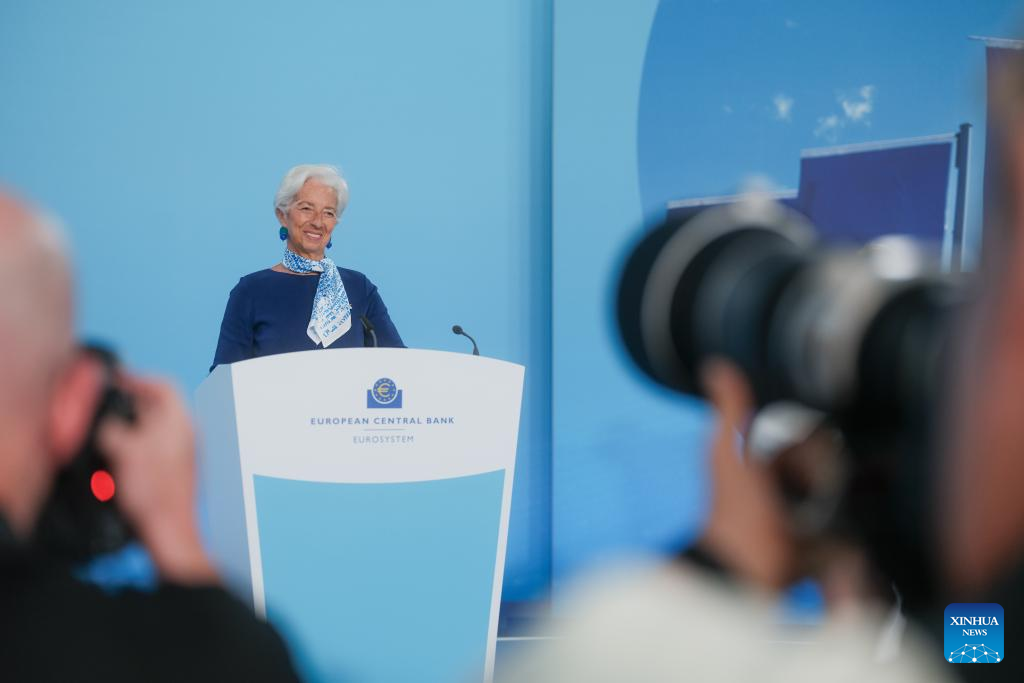European Central Bank President Christine Lagarde attends a press conference in Frankfurt, Germany, on July 24, 2025. The European Central Bank (ECB) announced on Thursday that it will keep key interest rates unchanged at its latest rate-setting meeting. (ECB/Handout via Xinhua)