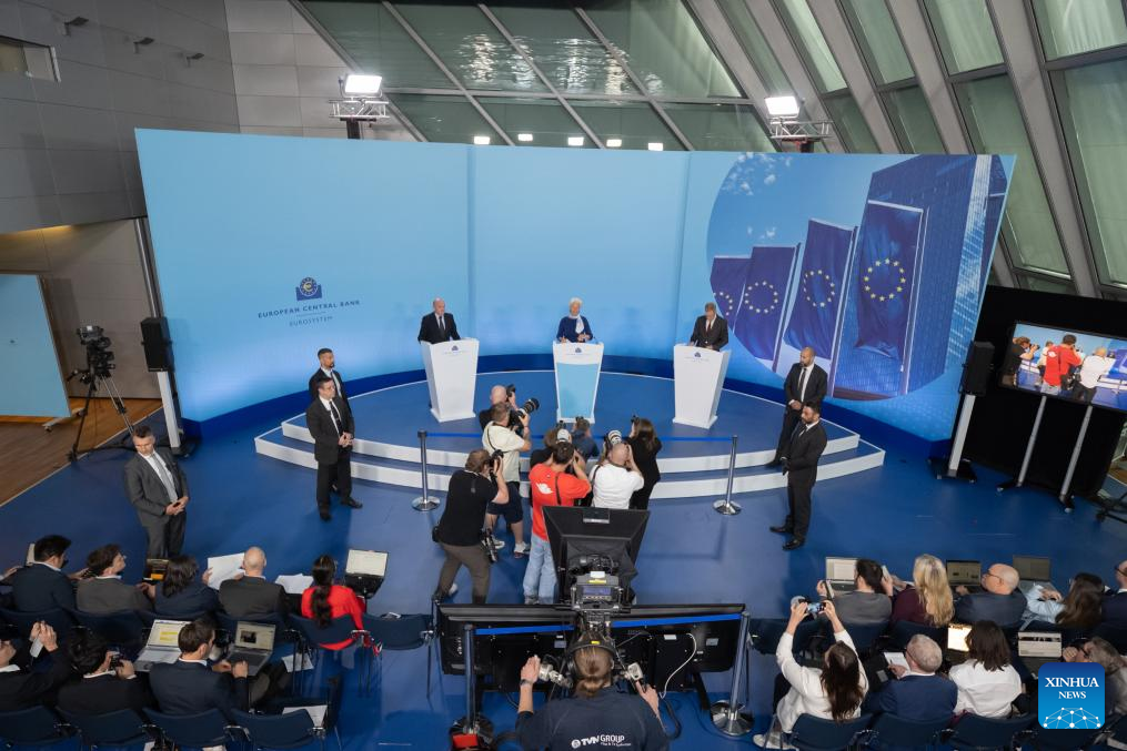 European Central Bank President Christine Lagarde (C, Rear) attends a press conference in Frankfurt, Germany, on July 24, 2025. The European Central Bank (ECB) announced on Thursday that it will keep key interest rates unchanged at its latest rate-setting meeting. (ECB/Handout via Xinhua)