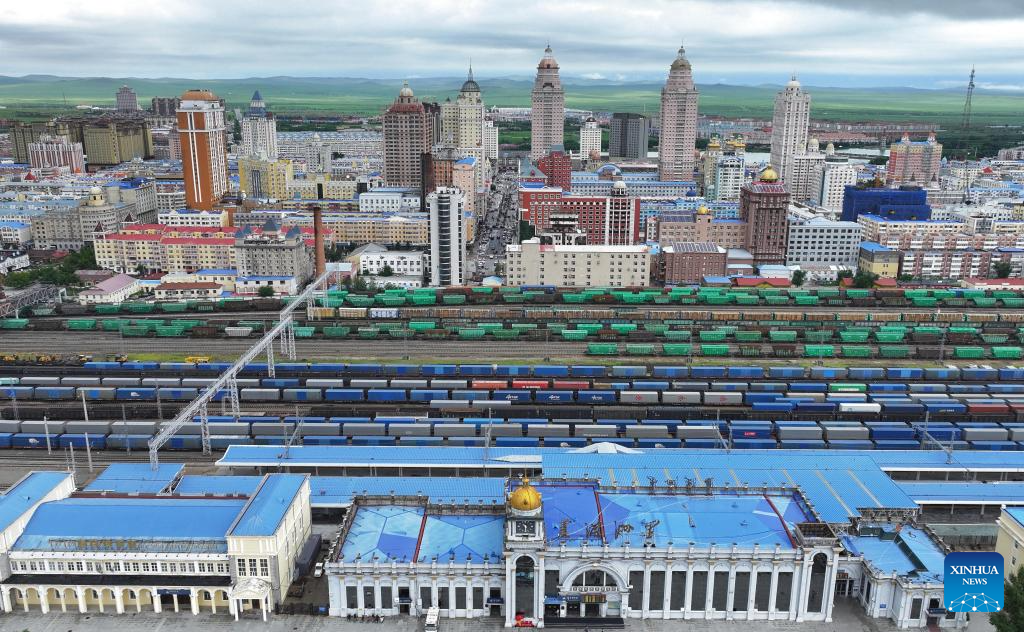 An aerial drone photo taken on July 24, 2025 shows a freight train departing from the railway station in Manzhouli, north China's Inner Mongolia Autonomous Region. The Manzhouli railway port, China's largest land port, has handled 30,000 China-Europe freight train trips and nearly 3 million TEUs (twenty-foot equivalent units) of goods since 2013. (Photo by Huang Xu/Xinhua)