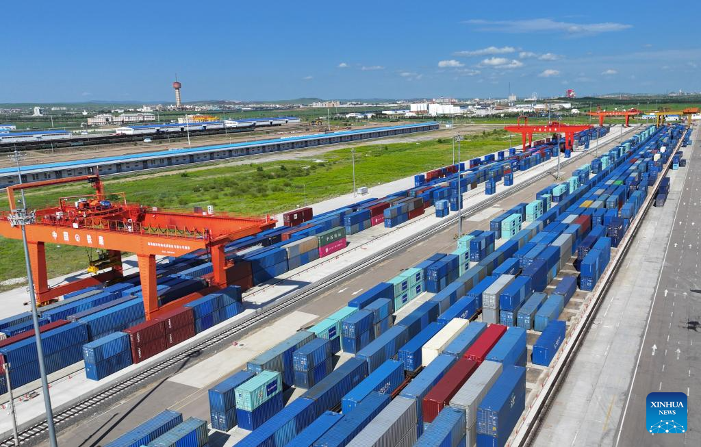 This photo shows containers being loaded at Manzhouli railway station in north China's Inner Mongolia Autonomous Region, July 25, 2025. The Manzhouli railway port, China's largest land port, has handled 30,000 China-Europe freight train trips and nearly 3 million TEUs (twenty-foot equivalent units) of goods since 2013. (Photo by Huang Xu/Xinhua)