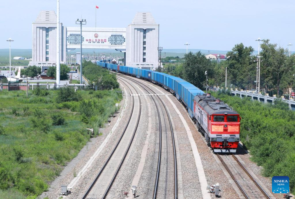 This photo taken on July 24, 2025 shows a freight train loaded with goods arriving at the railway station in Manzhouli, north China's Inner Mongolia Autonomous Region. The Manzhouli railway port, China's largest land port, has handled 30,000 China-Europe freight train trips and nearly 3 million TEUs (twenty-foot equivalent units) of goods since 2013. (Photo by Huang Xu/Xinhua)