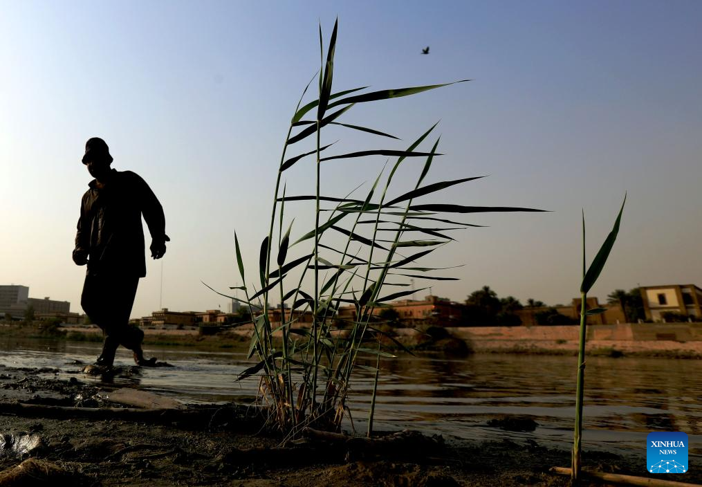 A man walks along the Tigris River in Baghdad, Iraq, on July 25, 2025. Iraq's Ministry of Water Resources said on Thursday that the drought affecting the country is due to low rainfall and reduced water inflows from upstream countries, warning of severe water insecurity across the country. (Xinhua/Khalil Dawood)