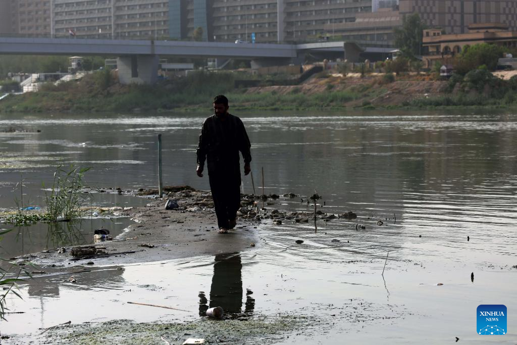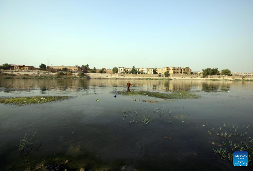 A man stands in the Tigris River in Baghdad, Iraq, on July 25, 2025. Iraq's Ministry of Water Resources said on Thursday that the drought affecting the country is due to low rainfall and reduced water inflows from upstream countries, warning of severe water insecurity across the country. (Xinhua/Khalil Dawood)