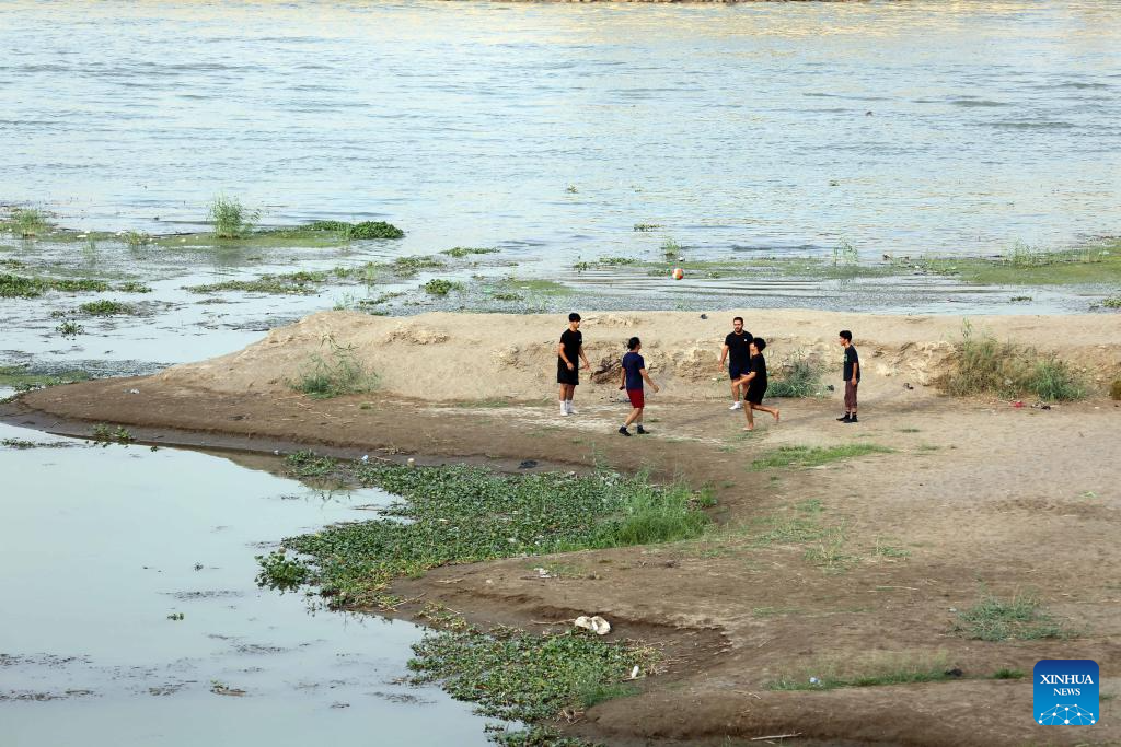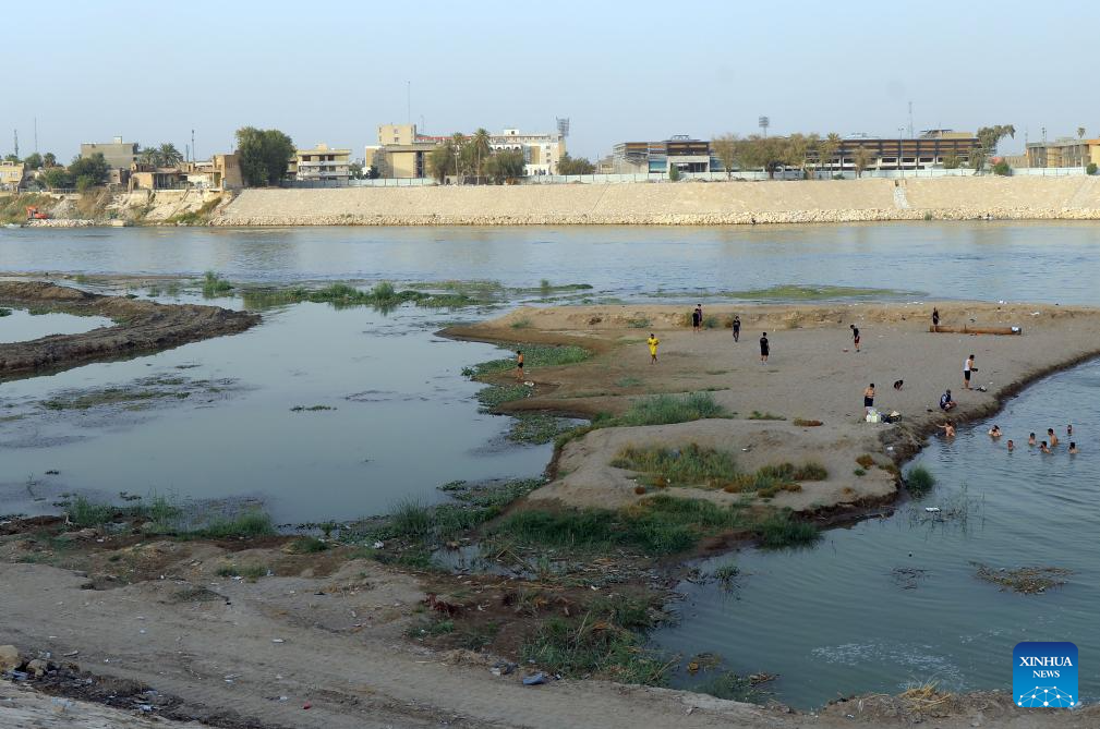 People spend time near the Tigris River in Baghdad, Iraq, on July 25, 2025. Iraq's Ministry of Water Resources said on Thursday that the drought affecting the country is due to low rainfall and reduced water inflows from upstream countries, warning of severe water insecurity across the country. (Xinhua/Khalil Dawood)
