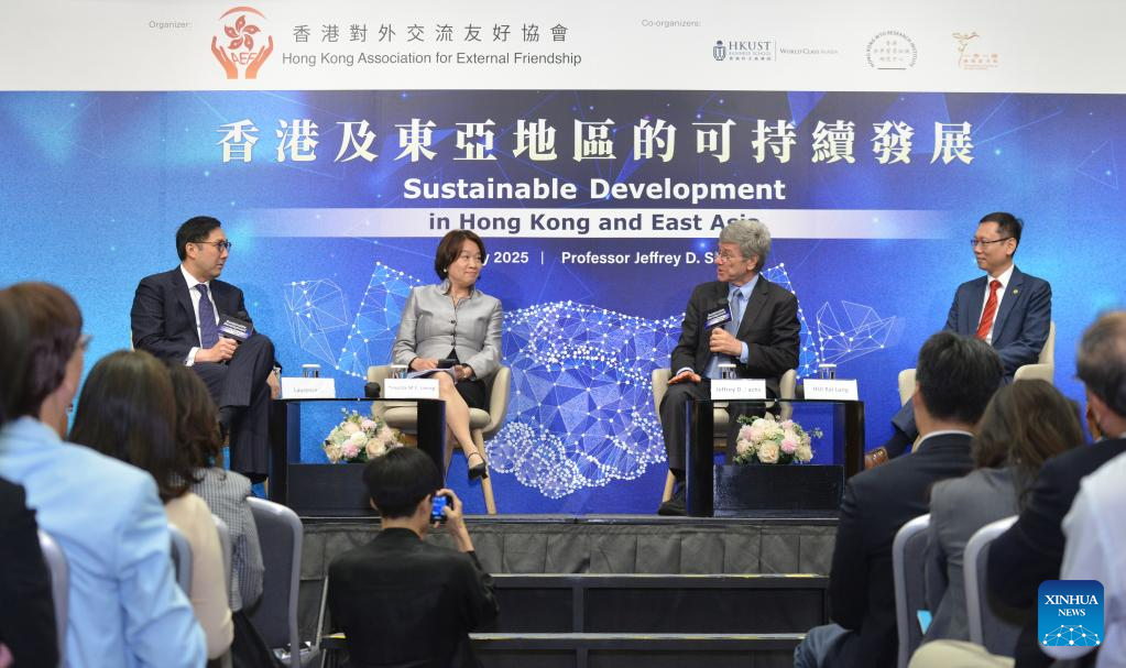 U.S. economist Jeffrey Sachs (2nd R) attends an event titled "Sustainable Development in Hong Kong and East Asia" in Hong Kong, south China, July 24, 2025. (Hong Kong Association of External Friendship/Handout via Xinhua)