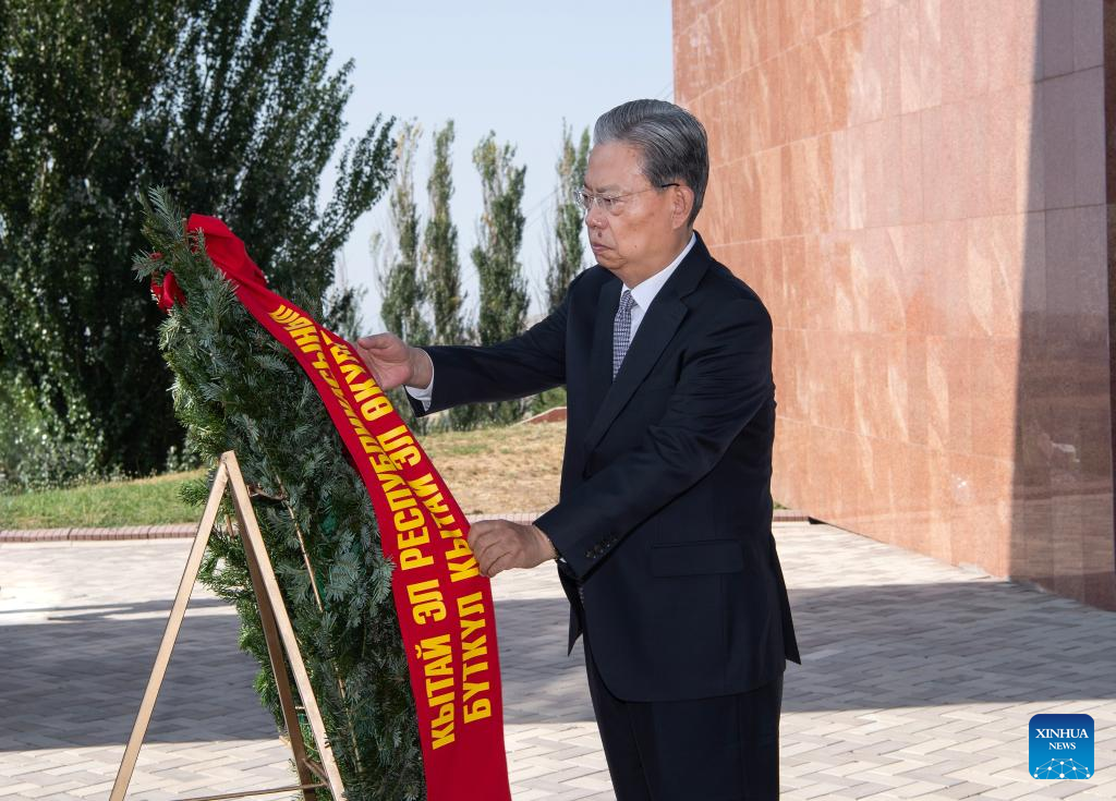 Zhao Leji, chairman of the National People's Congress (NPC) Standing Committee, lays a wreath at the Great Urkun memorial in Bishkek, Kyrgyzstan, July 23, 2025. At the invitation of Kyrgyz Parliament Speaker Nurlanbek Turgunbek uulu, Zhao paid an official goodwill visit to Kyrgyzstan from Wednesday to Thursday. (Xinhua/Li Tao)