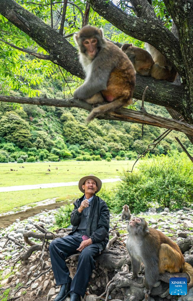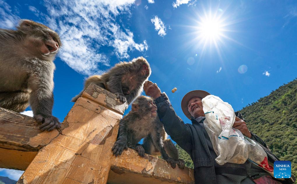 Tobgye feeds peanuts to Tibetan macaques at Linze ecological and cultural scenic area in Linze Village of Gongbo'Gyamda County, Nyingchi City, southwest China's Xizang Autonomous Region, on July 23, 2025. Linze Village in Gongbo'Gyamda County is a well-known habitat of the Tibetan macaque, a national second-class protected animal.