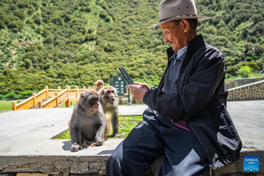 Tobgye take photos of Tibetan macaques at Linze ecological and cultural scenic area in Linze Village of Gongbo'Gyamda County, Nyingchi City, southwest China's Xizang Autonomous Region, on July 23, 2025. Linze Village in Gongbo'Gyamda County is a well-known habitat of the Tibetan macaque, a national second-class protected animal.