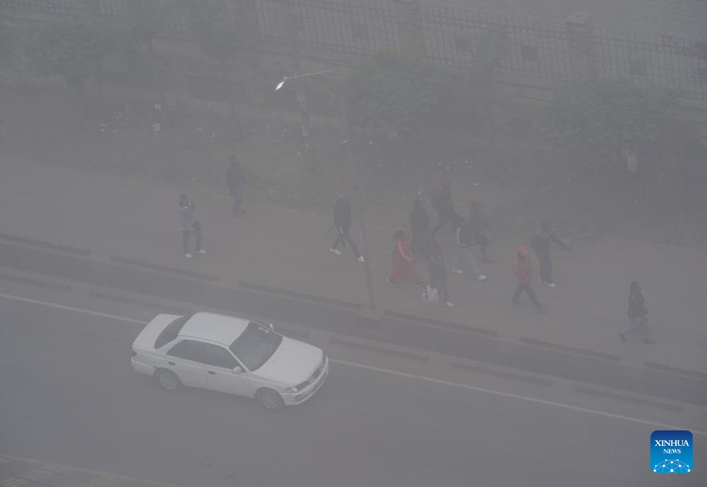 Vehicles and people are seen on a fog-shrouded street in Nairobi, Kenya, July 25, 2025. Thick fog blanketed Nairobi in the morning of Friday. (Xinhua/Han Xu)