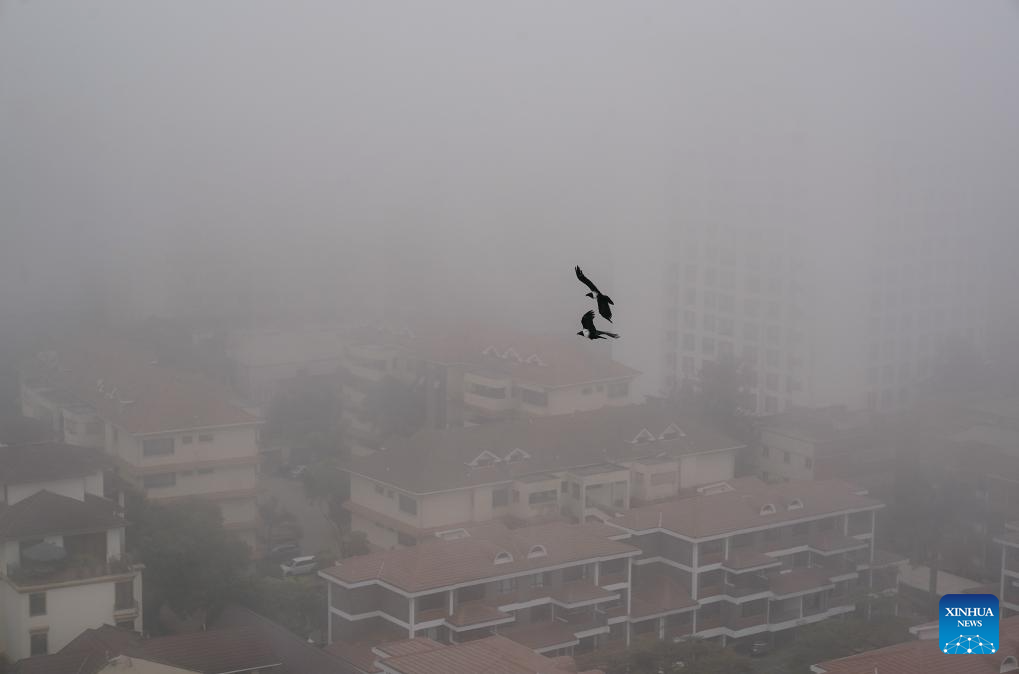Birds fly over fog-shrouded buildings in Nairobi, Kenya, July 25, 2025. Thick fog blanketed Nairobi in the morning of Friday. (Xinhua/Han Xu)