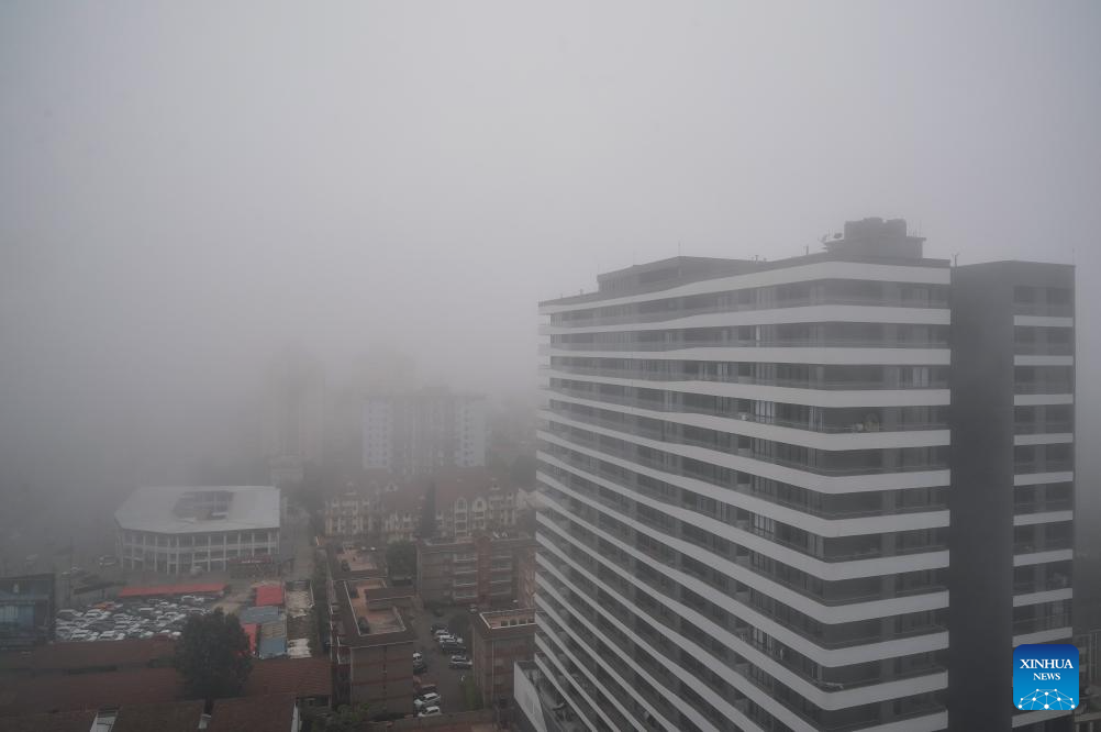 This photo taken on July 25, 2025 shows buildings shrouded in fog in Nairobi, Kenya. Thick fog blanketed Nairobi in the morning of Friday. (Xinhua/Han Xu)