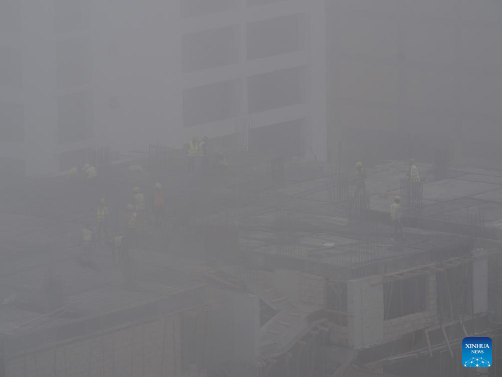 Construction workers operate in fog in Nairobi, Kenya, July 25, 2025. Thick fog blanketed Nairobi in the morning of Friday. (Xinhua/Han Xu)