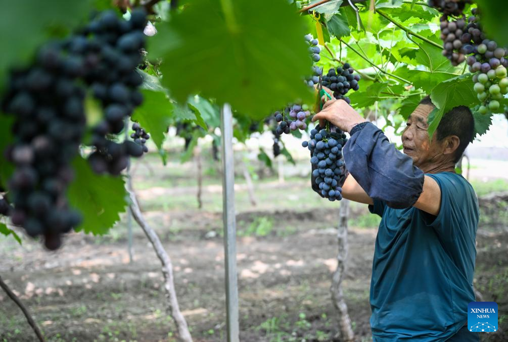 A famer harvests grapes at the Chadian Grape Science and Technology Park in Chadian Subdistrict, Binhai New Area in north China's Tianjin, July 24, 2025. Chadian has accelerated the standardized grape cultivation to improve both the yield and quality of the grapes, and increase the income of farmers. (Xinhua/Zhao Zishuo)