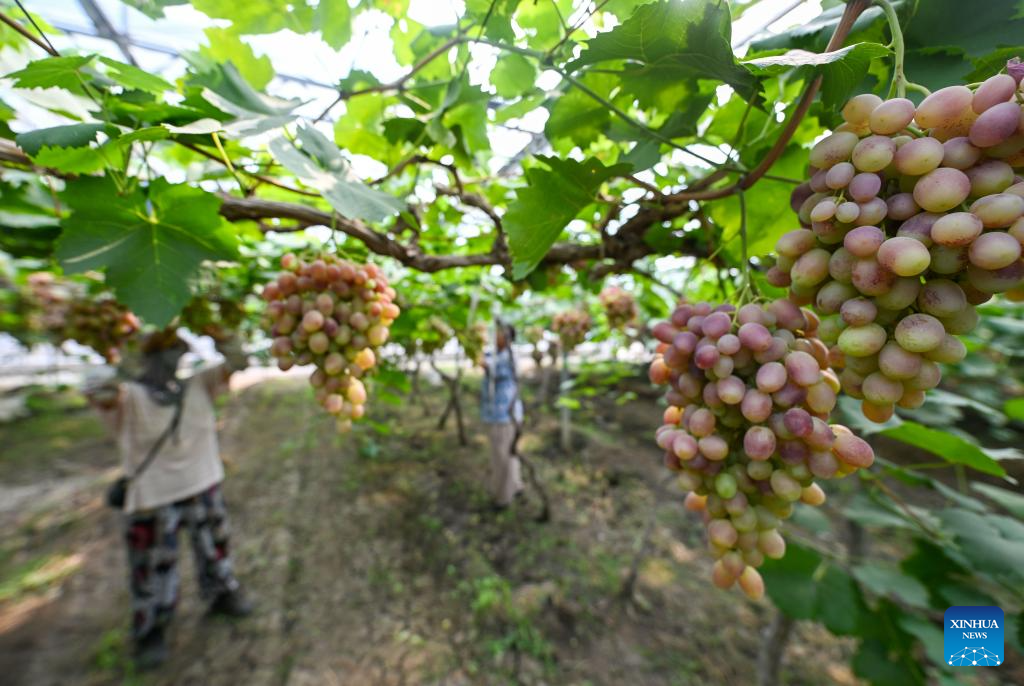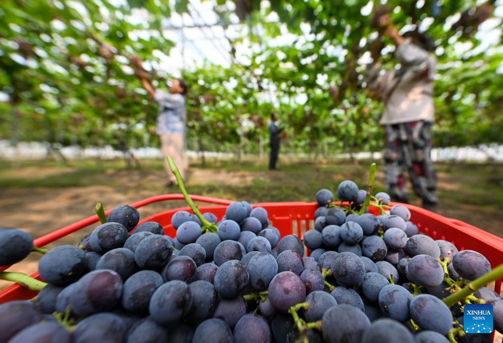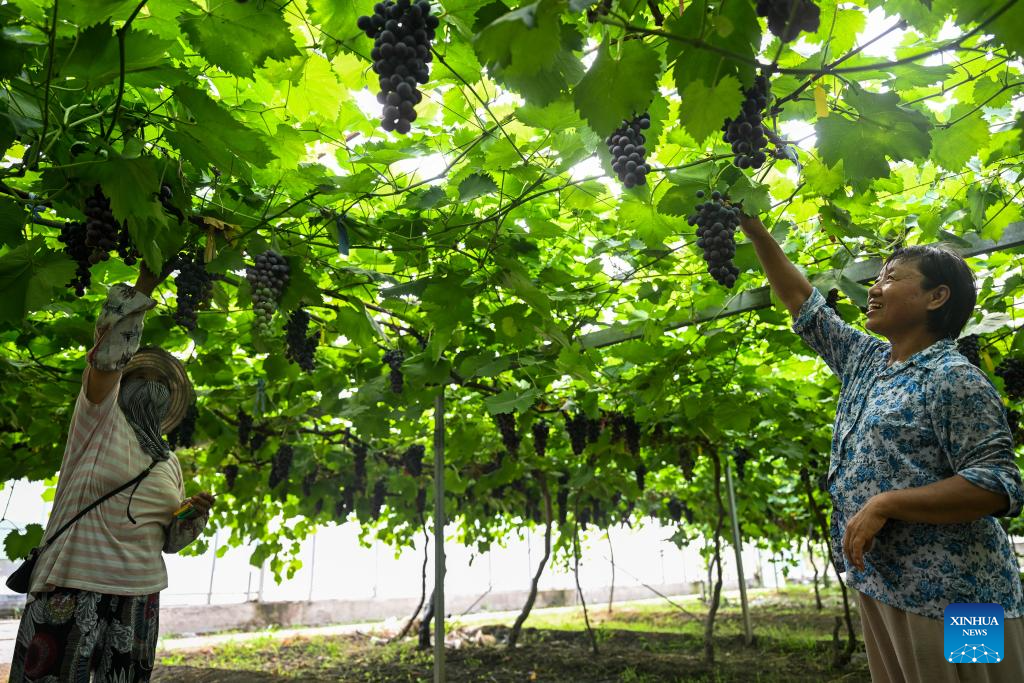 Farmers harvest grapes at the Chadian Grape Science and Technology Park in Chadian Subdistrict, Binhai New Area in north China's Tianjin, July 24, 2025. Chadian has accelerated the standardized grape cultivation to improve both the yield and quality of the grapes, and increase the income of farmers. (Xinhua/Zhao Zishuo)