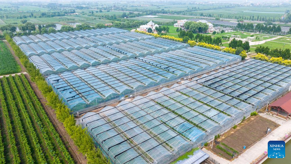 An aerial drone photo taken on July 24, 2025 shows the Chadian Grape Science and Technology Park in Chadian Subdistrict, Binhai New Area in north China's Tianjin. Chadian has accelerated the standardized grape cultivation to improve both the yield and quality of the grapes, and increase the income of farmers. (Xinhua/Zhao Zishuo)
