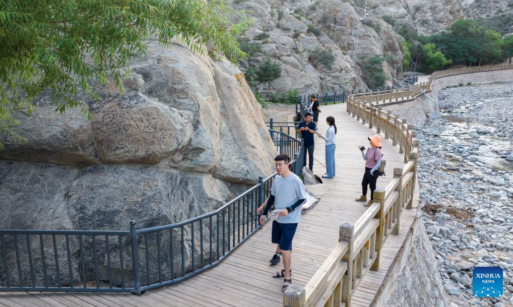 A drone photo taken on July 23, 2025 shows tourists visiting Helan Mountain rock painting scenic spot in Yinchuan, northwest China's Ningxia Hui Autonomous Region. Helan Mountain is noted for more than 20,000 cliff paintings and carvings created by the nomads that once lived in northern China. These works depict herding, hunting, sacrificial rites and the lives of the people who lived 3,000 to 10,000 years ago. Images of animals dominate, followed by humans, vehicles, plants, planets, fingerprints and abstract signs.
