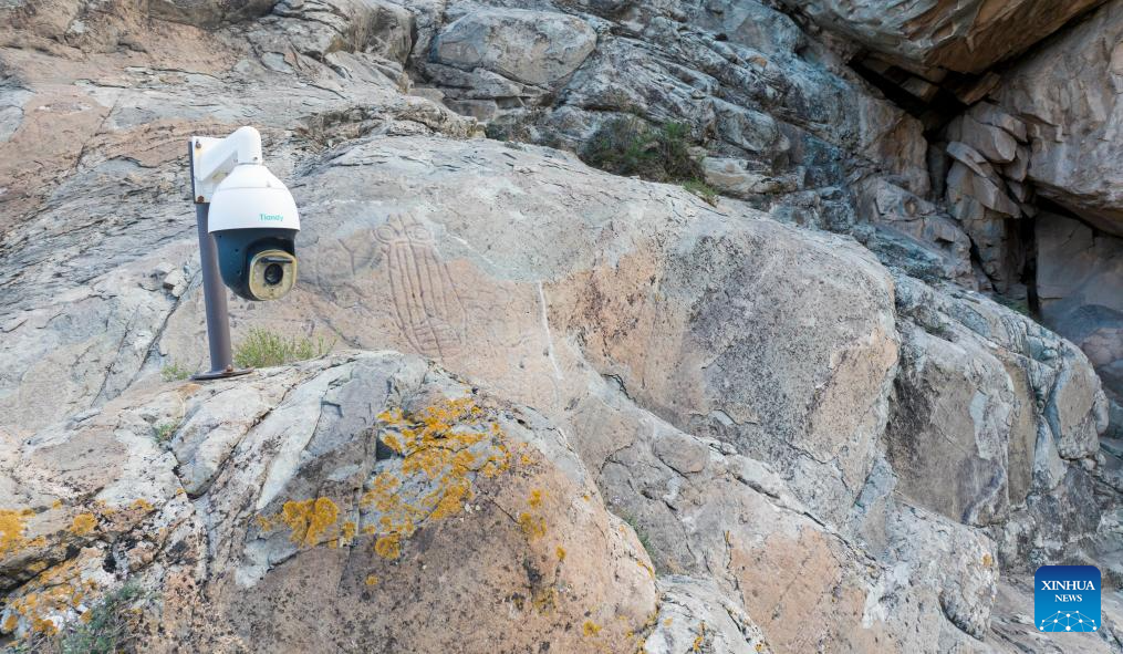 A drone photo taken on July 23, 2025 shows a surveillance camera at Helan Mountain rock painting scenic spot in Yinchuan, northwest China's Ningxia Hui Autonomous Region. There are more than 100 surveillance cameras at the scenic spot now to monitor cliff paintings. Helan Mountain is noted for more than 20,000 cliff paintings and carvings created by the nomads that once lived in northern China. These works depict herding, hunting, sacrificial rites and the lives of the people who lived 3,000 to 10,000 years ago. Images of animals dominate, followed by humans, vehicles, plants, planets, fingerprints and abstract signs.