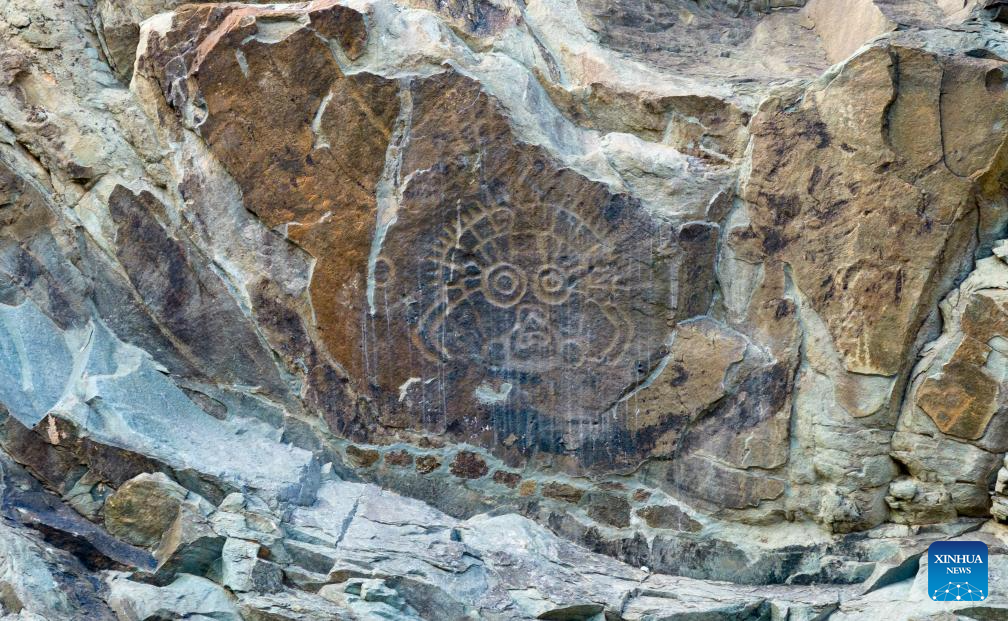 A drone photo taken on July 23, 2025 shows a cliff painting at Helan Mountain rock painting scenic spot in Yinchuan, northwest China's Ningxia Hui Autonomous Region. Helan Mountain is noted for more than 20,000 cliff paintings and carvings created by the nomads that once lived in northern China. These works depict herding, hunting, sacrificial rites and the lives of the people who lived 3,000 to 10,000 years ago. Images of animals dominate, followed by humans, vehicles, plants, planets, fingerprints and abstract signs.