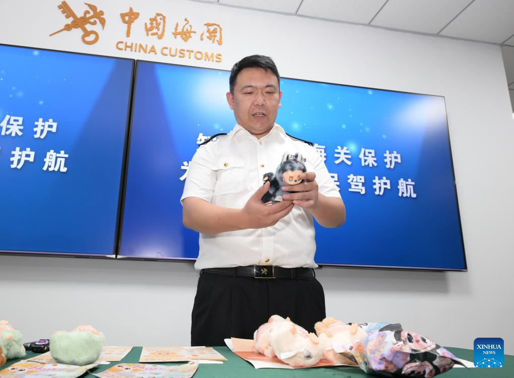 The Beijing Customs hosted an open day event for media professionals on Friday to showcase some of the counterfeit goods it has seized recently. It has intercepted over 30,000 items in 13 batches of suspected counterfeit products of Pop Mart, a popular Chinese brand for trendy toys, since early this year. (Xinhua/Li He)