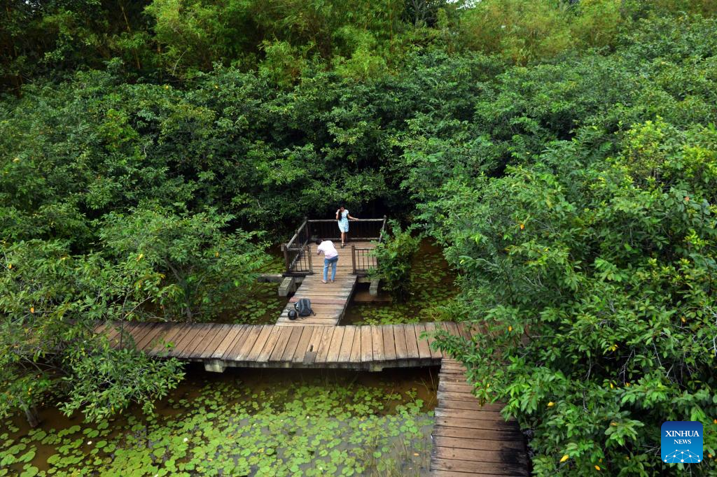 A tourist poses for photos with mangroves at Beddagana Wetland Park in Colombo, Sri Lanka, July 24, 2025. July 26 marks the International Day for the Conservation of the Mangrove Ecosystem. Sri Lanka's mangroves play an important role in purifying seawater, buffering coastal storms, sequestering carbon and sustaining biodiversity. (Photo by Gayan Sameera/Xinhua)
