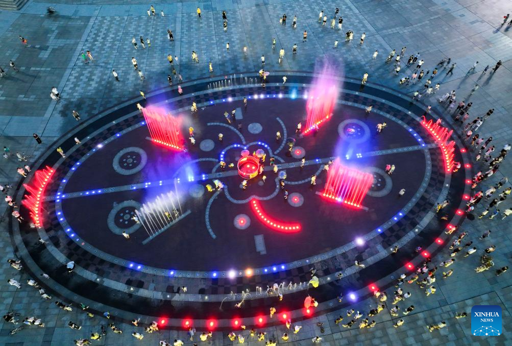 An aerial drone photo taken on July 24, 2025 shows poeple gathering at a fountain to cool off in Jiyuan, central China's Henan Province. With heat waves gripping many regions across the country, diverse "cooling tourism" events, such as water-related activities and night tours, have grown in popularity, invigorating the summer economy. (Photo by Miao Qiunao/Xinhua)