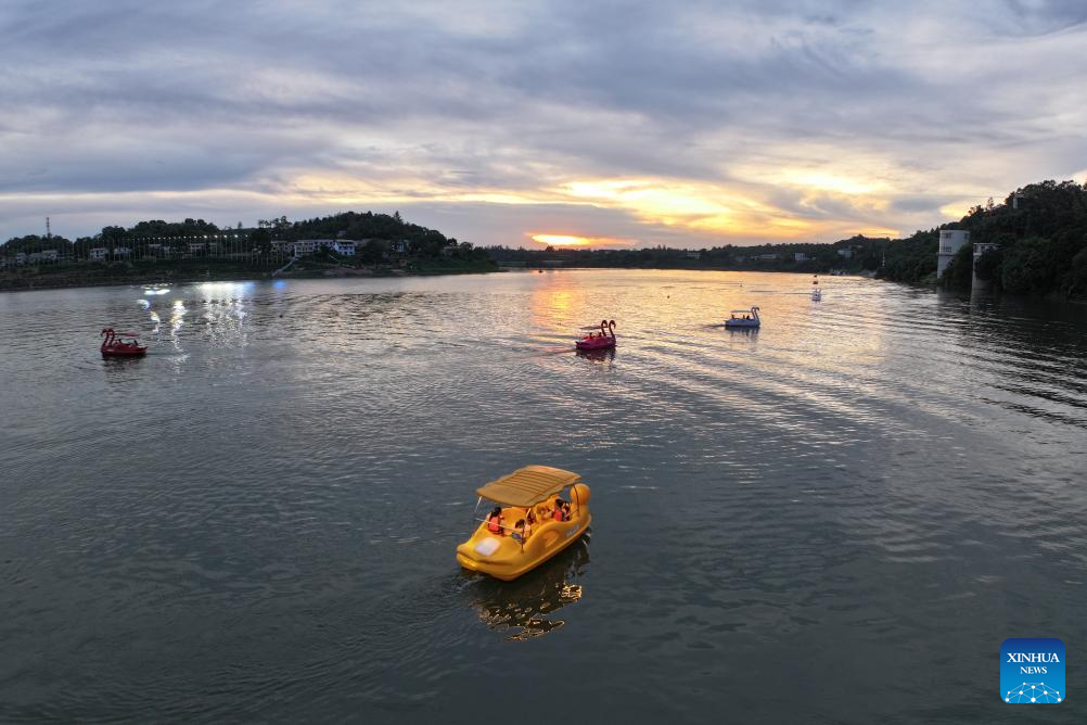 People take boats at Jialing River in Guang'an City, southwest China's Sichuan Province, July 25, 2025. With heat waves gripping many regions across the country, diverse "cooling tourism" events, such as water-related activities and night tours, have grown in popularity, invigorating the summer economy. (Photo by Xia Junlin/Xinhua)