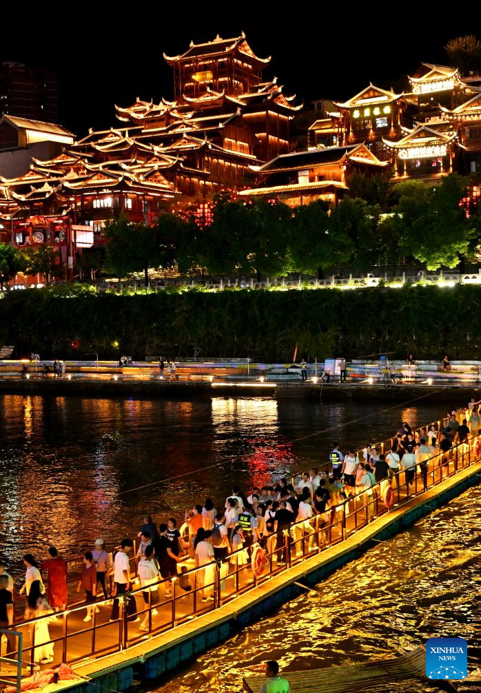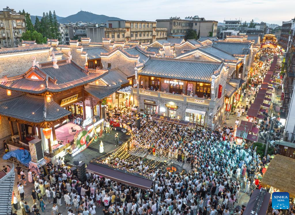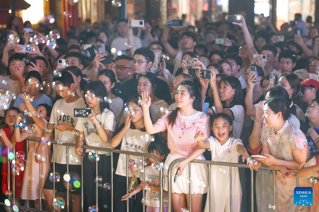Tourists watch a nighttime performance in Xiangyang ancient town in Xiangyang City, central China's Hubei Province, July 25, 2025. With heat waves gripping many regions across the country, diverse "cooling tourism" events, such as water-related activities and night tours, have grown in popularity, invigorating the summer economy. (Photo by Yang Dong/Xinhua)