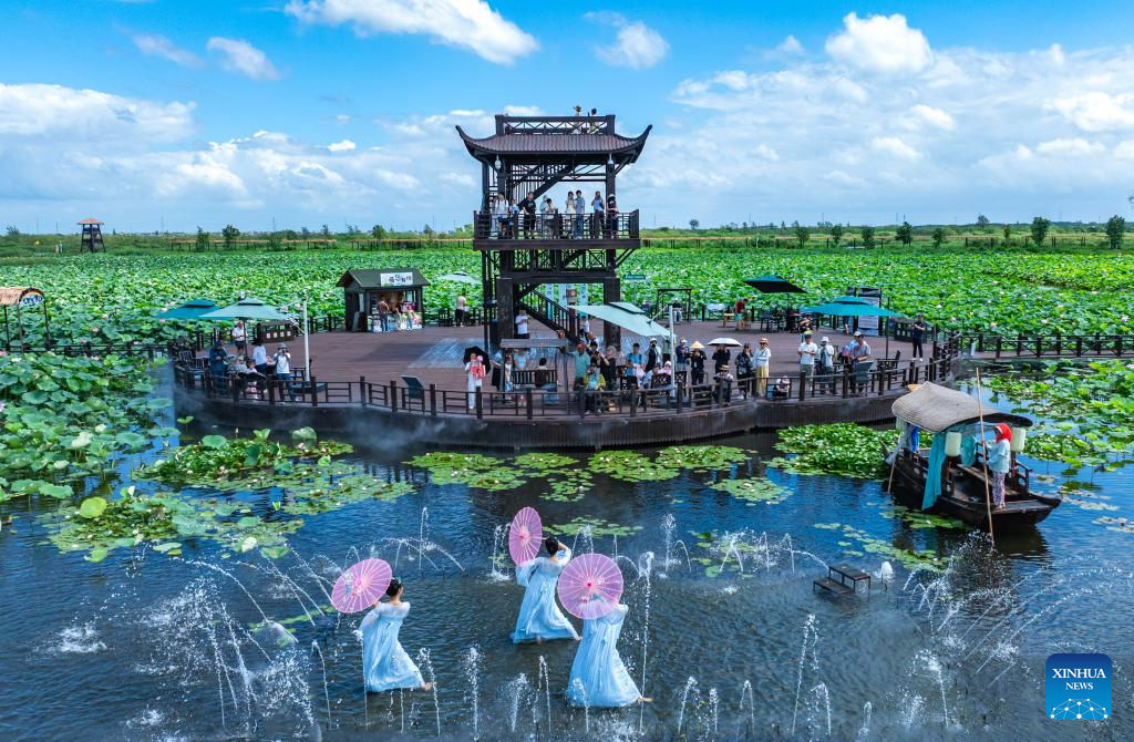 A drone photo taken on July 26, 2025 shows tourists enjoying lotus flowers in a boat at a scenic area in Xinghua, east China's Jiangsu Province. With heat waves gripping many regions across the country, diverse "cooling tourism" events, such as water-related activities and night tours, have grown in popularity, invigorating the summer economy. (Photo by Zhou Shegen/Xinhua)