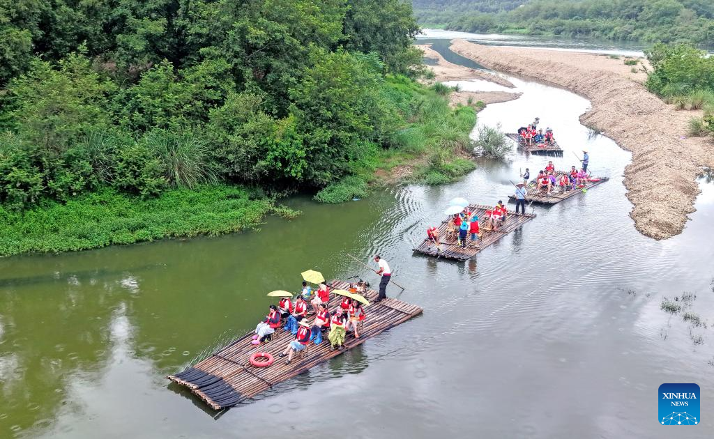 Tourists take bamboo rafts at a scenic area in Xuan'en County, Enshi Tujia and Miao Autonomous Prefecture, central China's Hubei Province, July 24, 2025. With heat waves gripping many regions across the country, diverse "cooling tourism" events, such as water-related activities and night tours, have grown in popularity, invigorating the summer economy. (Photo by Song Wen/Xinhua)