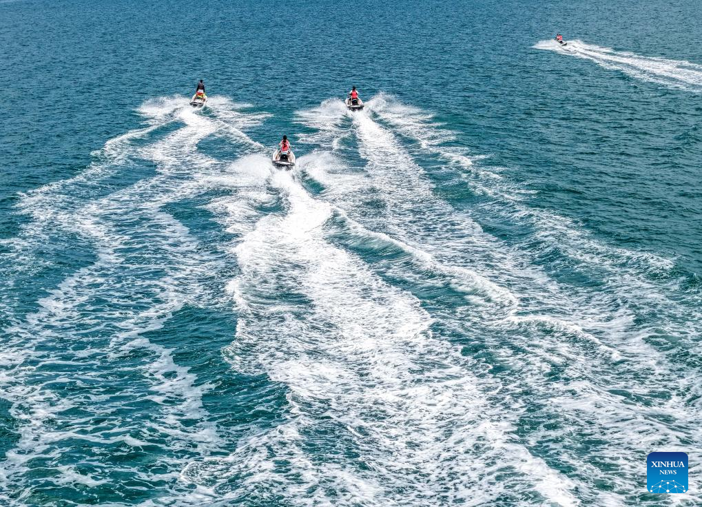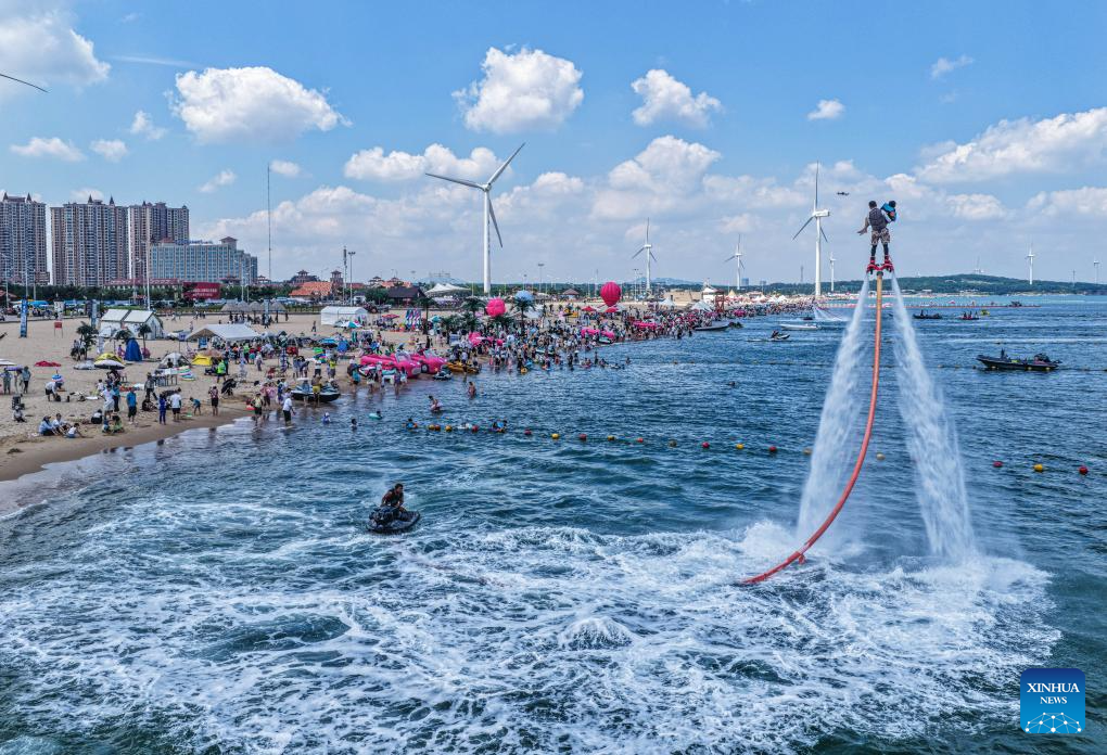 An aerial drone photo taken on July 24, 2025 shows tourists having fun at a scenic spot in Rongcheng City, east China's Shandong Province. With heat waves gripping many regions across the country, diverse "cooling tourism" events, such as water-related activities and night tours, have grown in popularity, invigorating the summer economy. (Photo by Li Xinjun/Xinhua)