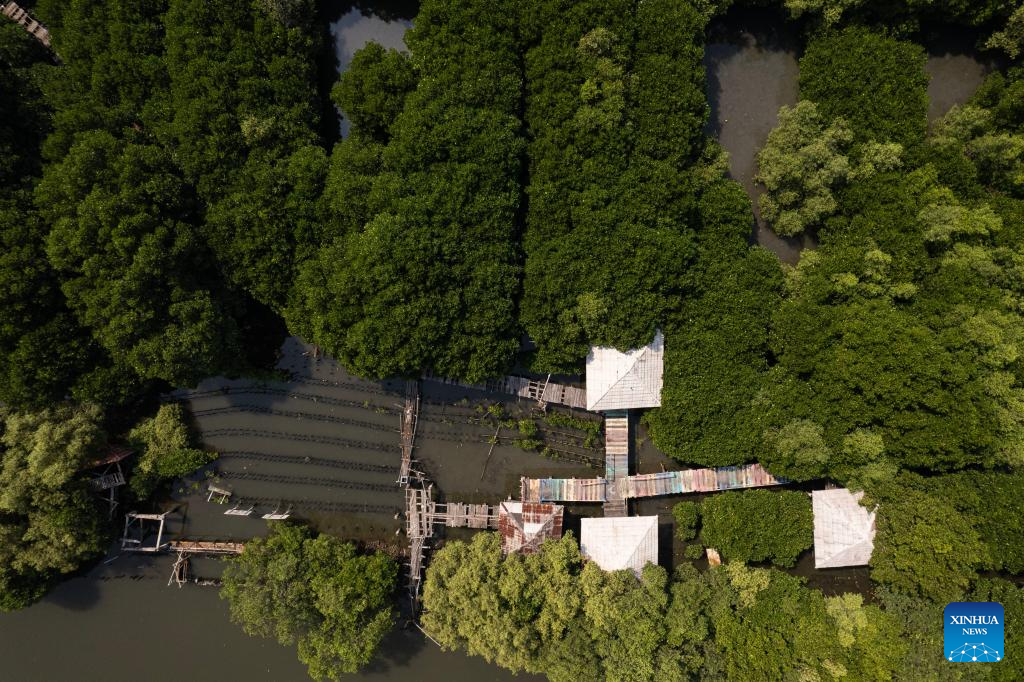 An aerial drone photo shows the mangrove forest on the coast near Tarumajaya village, in Bekasi district of West Java province, Indonesia, July 26, 2025. July 26 marks the International Day for the Conservation of the Mangrove Ecosystem. Adopted by the General Conference of the United Nations Educational, Scientific and Cultural Organisation (UNESCO) in 2015, this special day aims to raise awareness of the importance of mangrove ecosystems as "unique, special and vulnerable ecosystem" and to promote solutions for their sustainable management, conservation and uses. (Xinhua/Veri Sanovri)