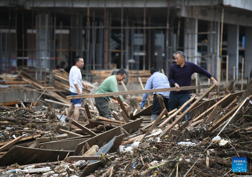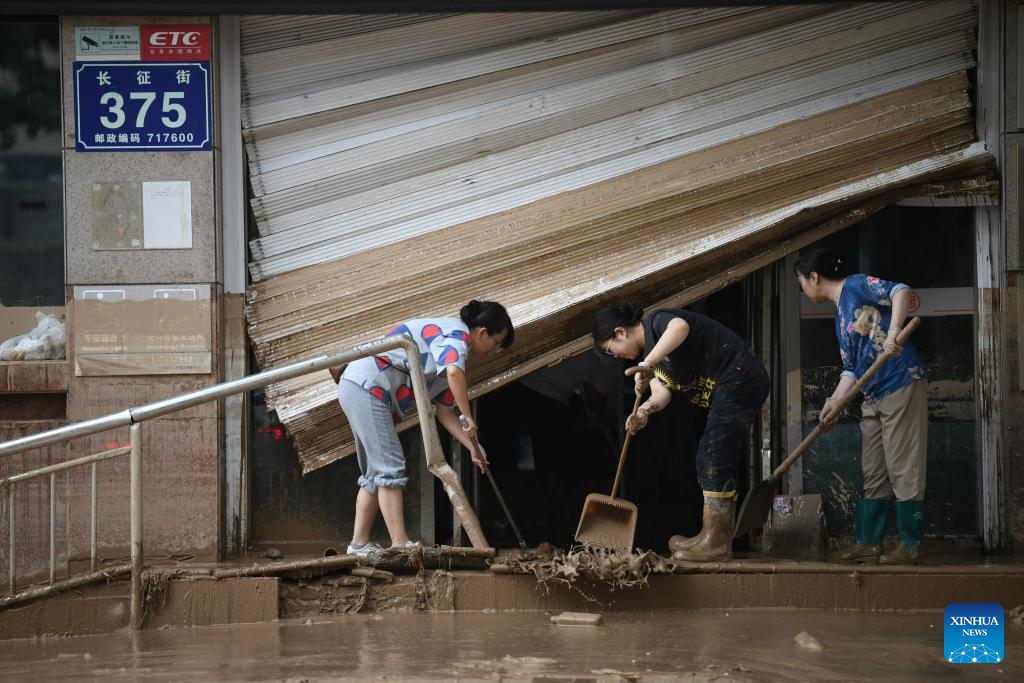 People clean up debris after flood in Wuqi County of Yan'an City in northwest China's Shaanxi Province, July 26, 2025. Heavy rainfall has affected Wuqi County since Thursday, resulting in severe flooding. Local authorities have activated Level-III emergency response for flood prevention and control, with dedicated resources for disaster relief and restoration.