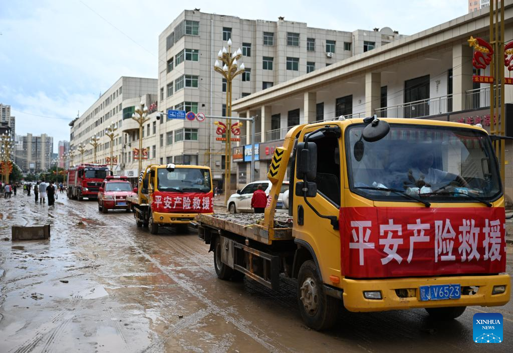 Vehicles for emergency services are seen on a street after flood in Wuqi County of Yan'an City in northwest China's Shaanxi Province, July 26, 2025. Heavy rainfall has affected Wuqi County since Thursday, resulting in severe flooding. Local authorities have activated Level-III emergency response for flood prevention and control, with dedicated resources for disaster relief and restoration.