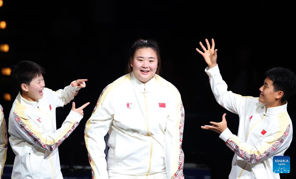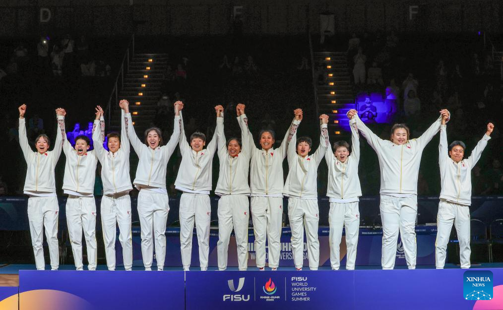 Players of team China celebrate after the women's basketball final between China and the United States at the Rhine-Ruhr 2025 FISU World University Games in Essen, Germany, July 25, 2025. (Xinhua/Zhang Fan)