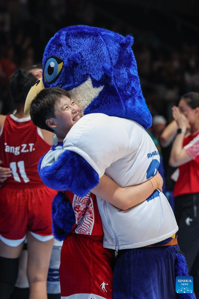 Cao Boyi of China hugs the mascot to celebrate victory after the women's basketball final between China and the United States at the Rhine-Ruhr 2025 FISU World University Games in Essen, Germany, July 25, 2025. (Xinhua/Zhang Fan)