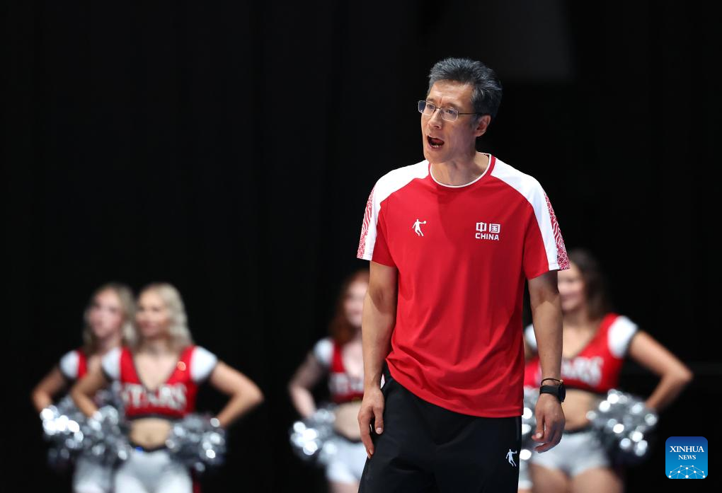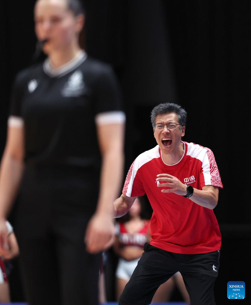 Li Sunnan, coach of team China, reacts during the women's basketball final between China and the United States at the Rhine-Ruhr 2025 FISU World University Games in Essen, Germany, July 25, 2025. (Xinhua/Zhang Chen)