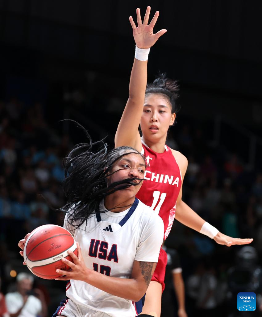 Liu Yutong (3rd R) of China goes to basket during the women's basketball final between China and the United States at the Rhine-Ruhr 2025 FISU World University Games in Essen, Germany, July 25, 2025. (Xinhua/Zhang Fan)